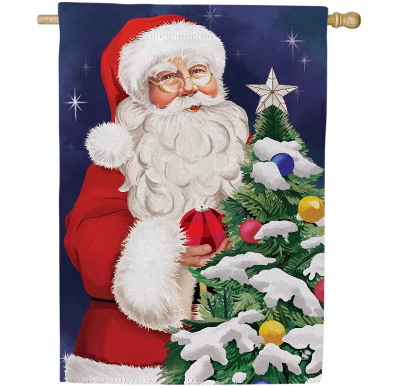 Add a touch of nostalgia to your holiday décor with classic jolly old St. Nicholas wearing his traditional red suit and spectacles. Standing beside a beautifully decorated Christmas tree adorned with colorful ornaments and a shining star, Santa reminds us of welcome holiday traditions. This unique, Evergreen Suede Reflection Flag is made of durable, medium weight, soft polyester suede material which is high quality and weatherproof, able to withstand continuous outdoor use without fading. A pole sleeve across the top makes it easy to hang from any standard pole. Size: 29" x 43"